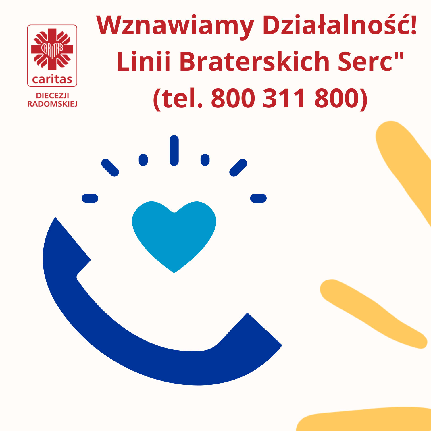 Caritas Diecezji Radomskiej prowadzi Telefon Zaufania „Linia Braterskich Serc”, który jest dostępny dla wszystkich osób potrzebujących wsparcia emocjonalnego, psychologicznego lub duchowego. Usługa ta jest skierowana do każdego, kto znajduje się w trudnej sytuacji życiowej i potrzebuje rozmowy z kimś, kto wysłucha, zrozumie, pomoże w znalezieniu wyjścia z problemu w bezpiecznym i anonimowym środowisku.