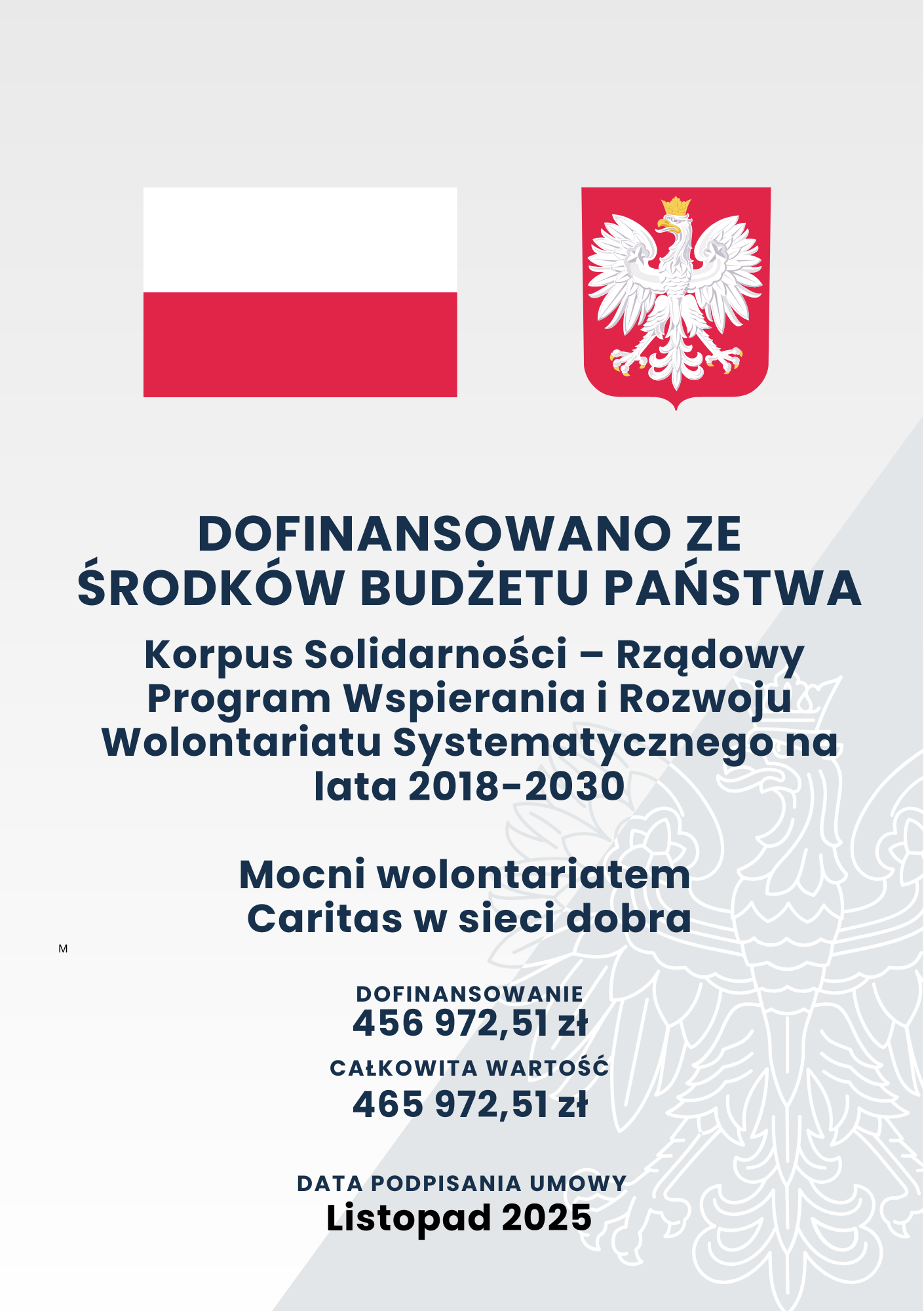 Z ogromną radością i dumą ogłaszamy, że Caritas naszej Diecezji wkracza w nowy, ekscytujący etap rozwoju! Podpisaliśmy umowę na realizację projektu „Mocni Wolontariatem – Caritas w sieci dobra” (lata 2025–2028).